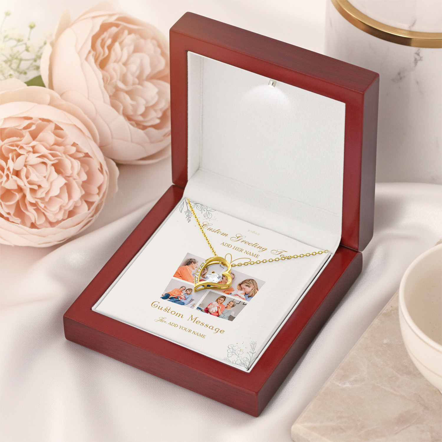 This necklace comes with a customizable card where you can add a custom photo and a custom message card that speaks from the heart. From family photos to milestone moments, you create a keepsake that feels deeply personal and beautifully timeless.
